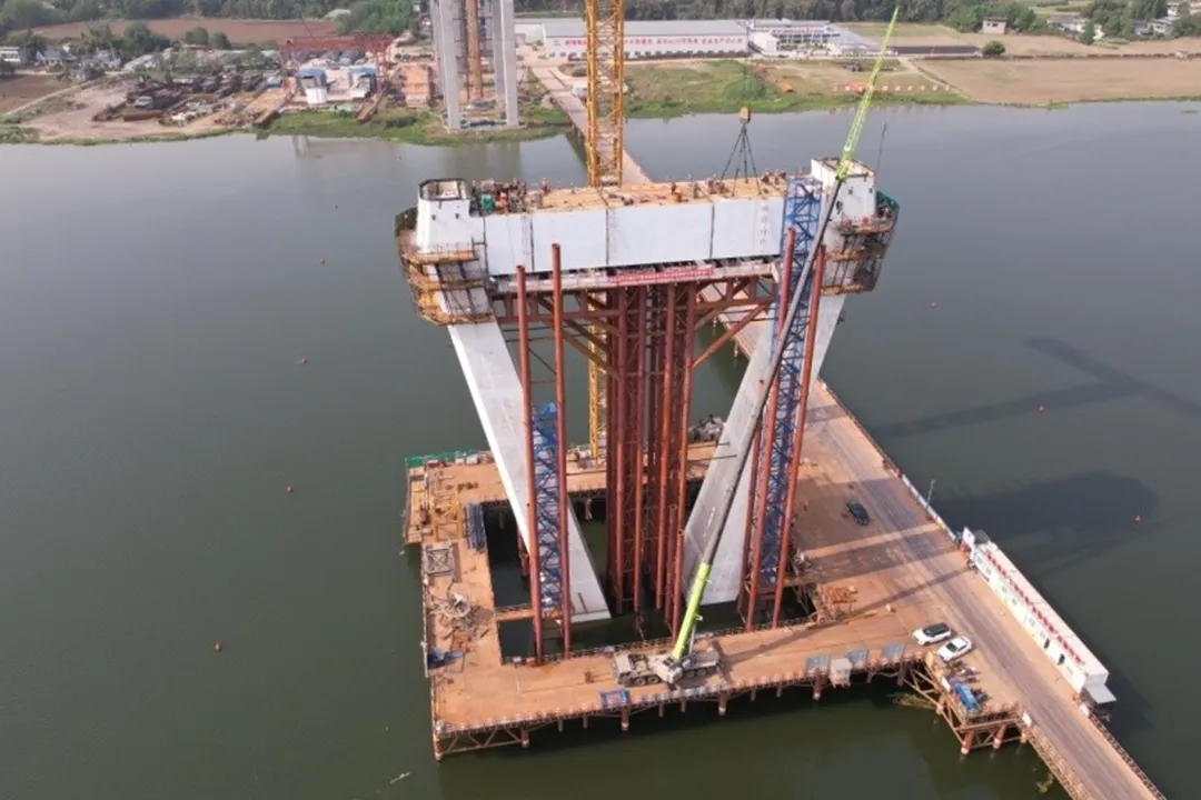 某特大桥位于四川省内,是四川省首座采用钢壳—混凝土组合索塔结构的大跨斜拉桥,全长4273米,采用205+490+205米双塔三跨斜拉桥横跨岷江。主塔为A型钢壳-混凝土组合索塔结构,高160.1米,由内外层附筋钢壳及内部C50补偿收缩混凝土共同构成“钢筋混凝土榫”协同受力体系。为我国山区高速桥梁向工业化智能建造技术转型升级做出有力探索。