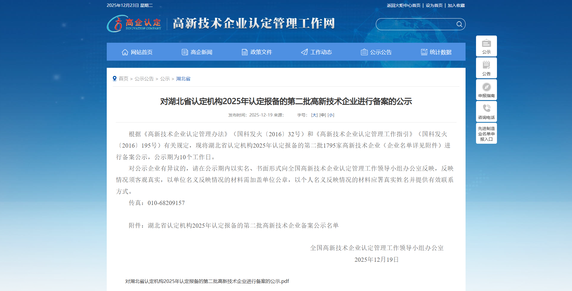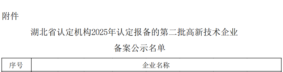 根据《高新技术企业认定管理办法》(国科发火〔2016〕32号)和《高新技术企业认定管理工作指引》(国科发火〔2016〕195号)有关规定,现将湖北省认定机构2025年认定报备的第二批1795家高新技术企业(企业名单详见附件)进行备案公示。