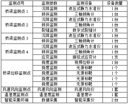 本方案拟布设桥梁结构监测,该桥梁位于广场穿行至教学楼,桥梁下方为某公园溪流构成,由四个压差式静力水准仪,两个三轴倾角计,一个数字式裂缝计,一个振弦式应变计,一套视频位移计含四个标靶,一套风速风向仪,一个温湿度计组成,每个监测点布设如下: